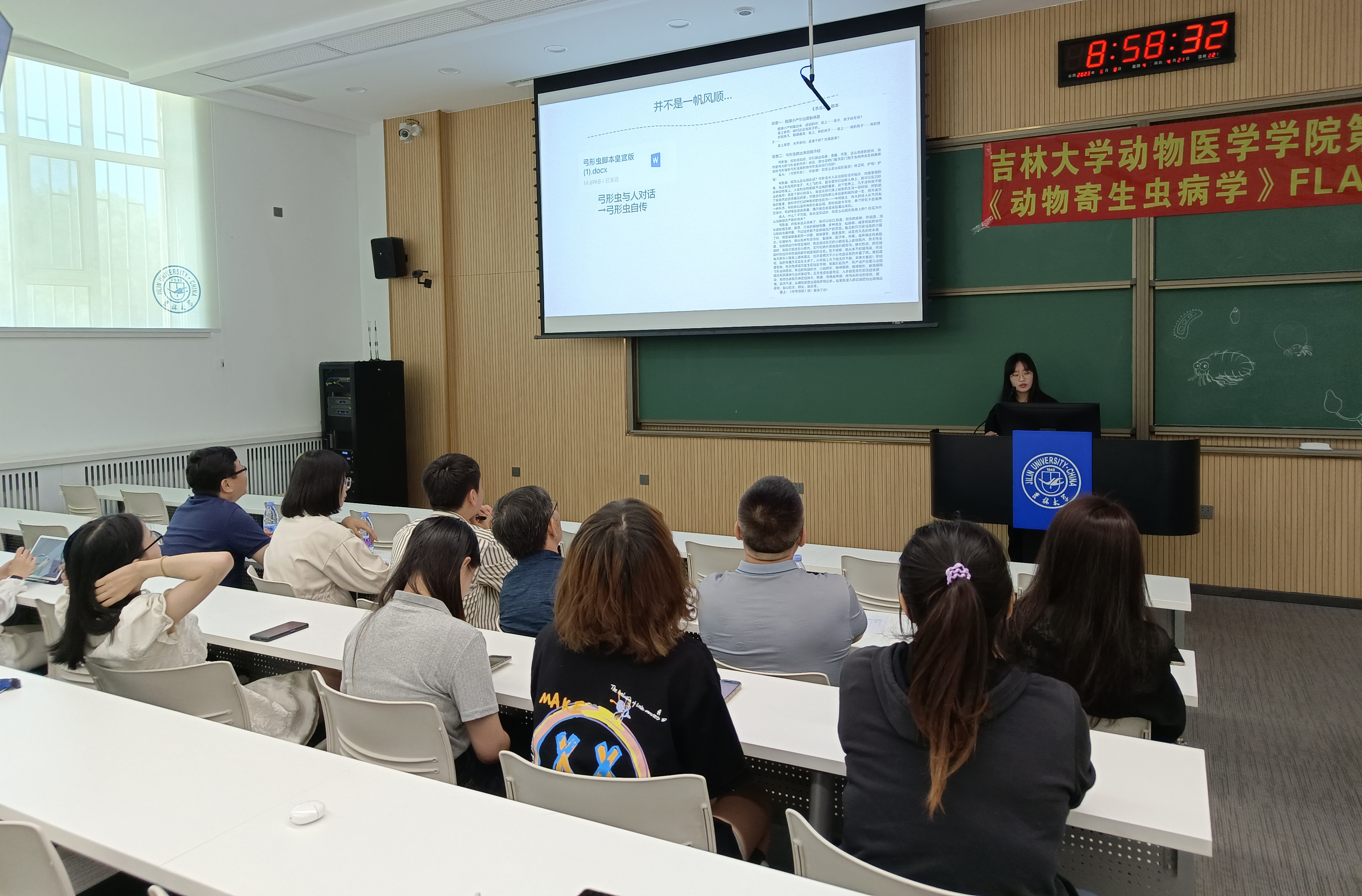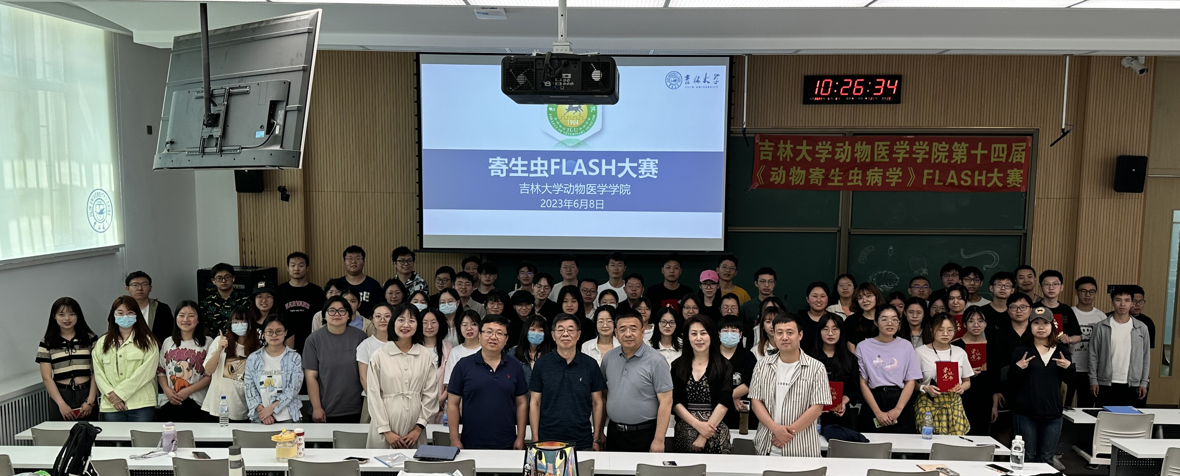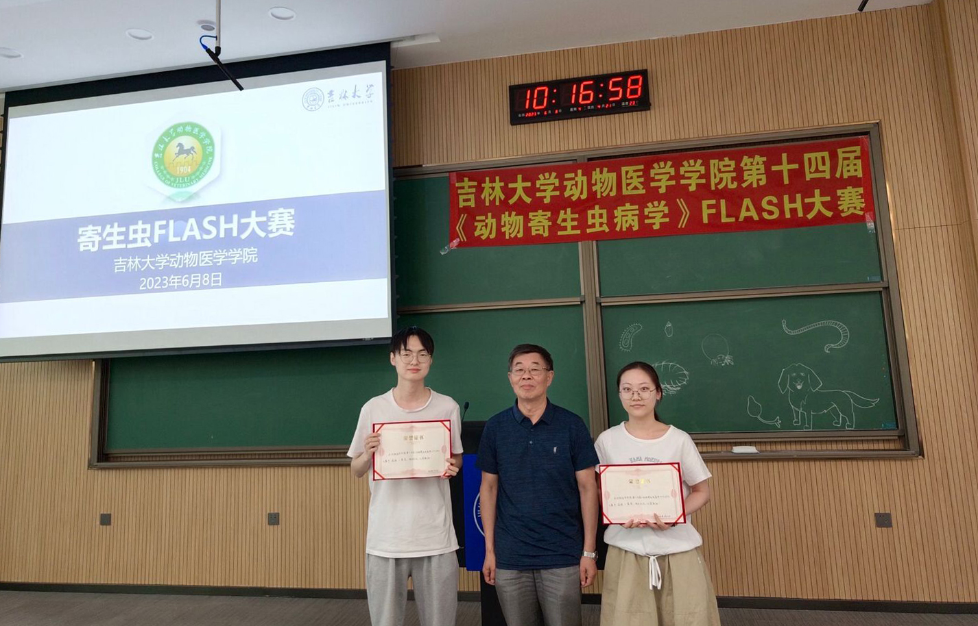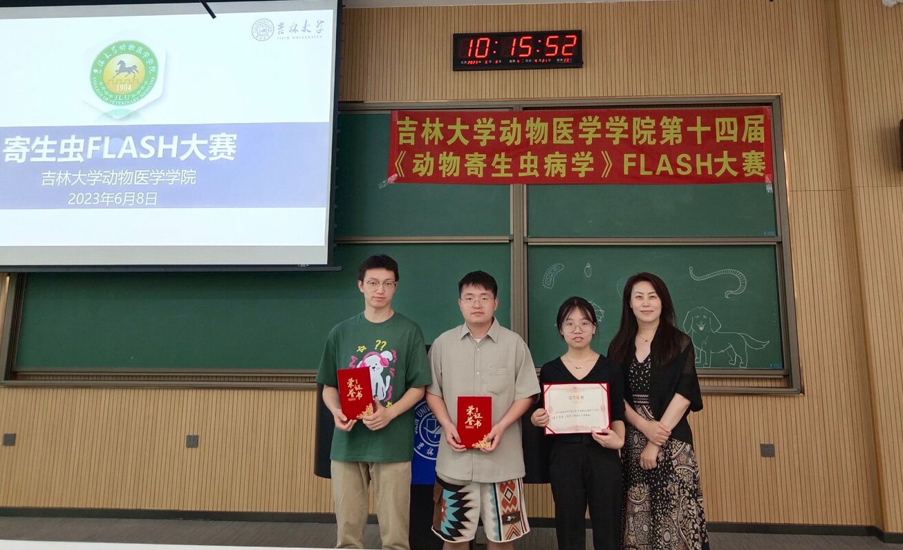 于2023年6月8日上午9点在科学讲堂100教室,成功举办了第十四届《动物寄生虫病学》FLASH大赛。大赛现场的评委嘉宾有国家级一流本科课程《动物寄生虫病学》课程负责人张西臣教授,五楼自拍