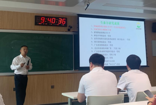 接下来,姜殿国副总经理通过讲解人生幸福模型、大学生职业生涯模型、职业发展三年一个阶段、“三业”认知模型,确定岗位就业等内容引导同学们对职业规划的系统性思考。同时以生泰尔集团事业板块为例,为同学们分析了动物保健品行业的就业岗位。