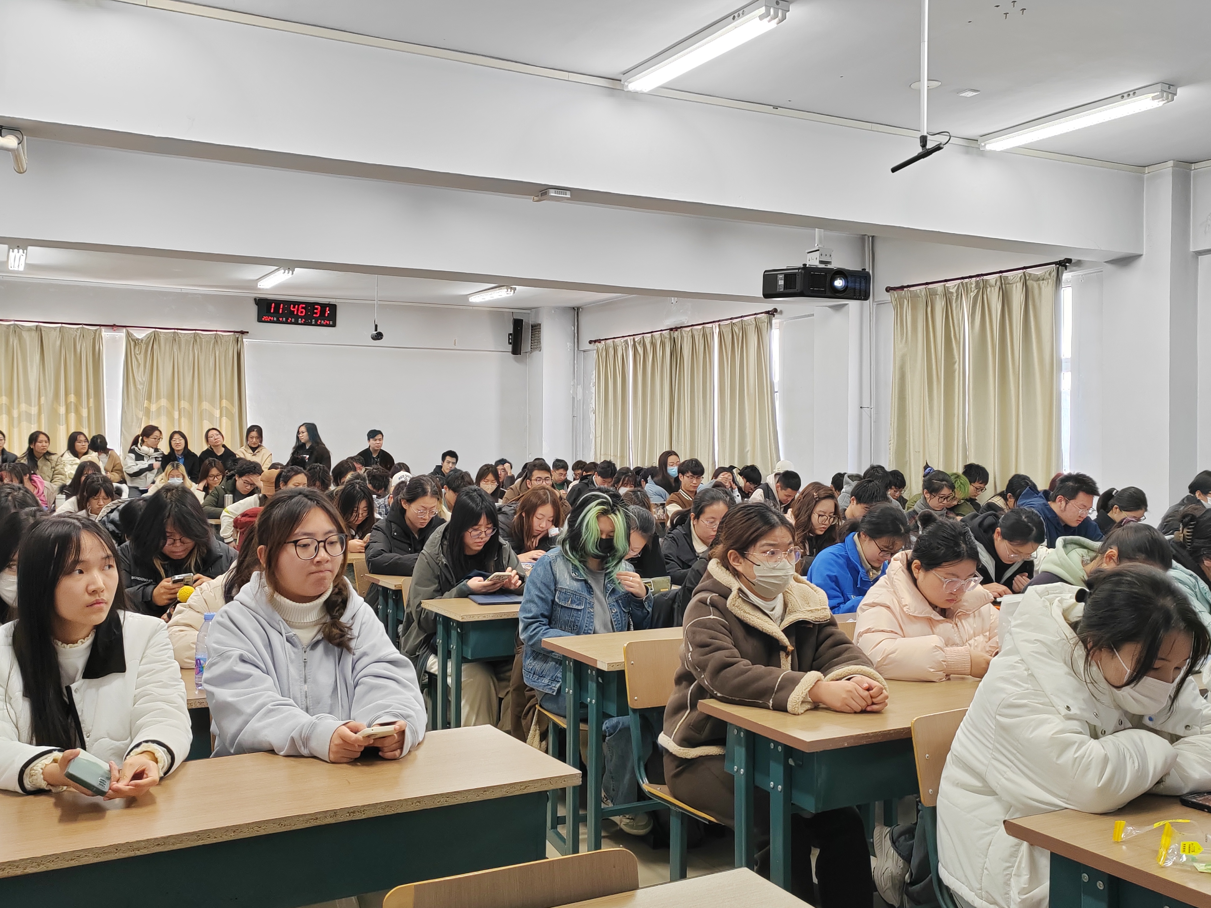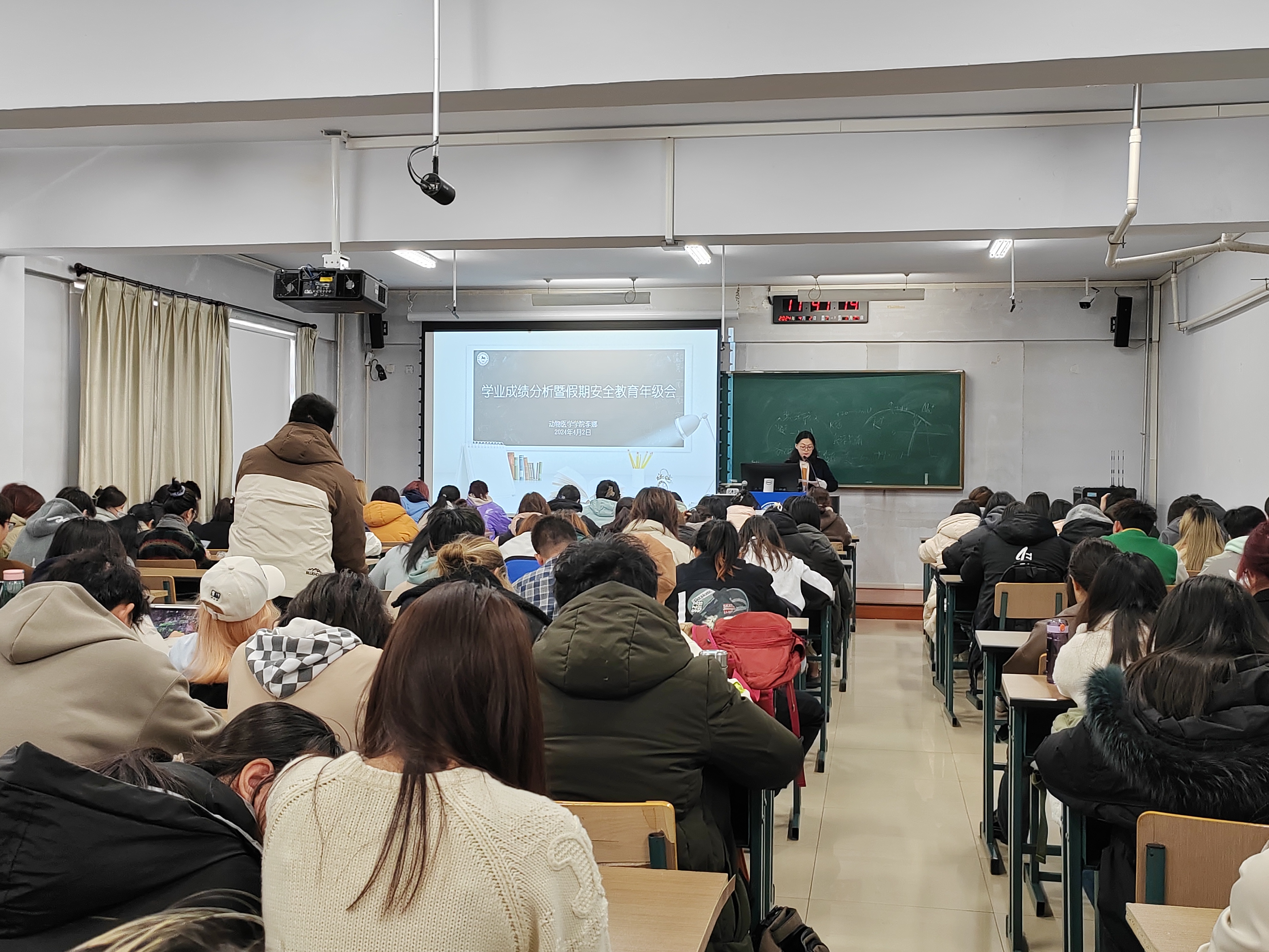 于和平校区实验楼401教室召开了2022级本科生学风教育、安全教育年级会,大会由辅导员老师李娜主持,2022级全体本科生参加。