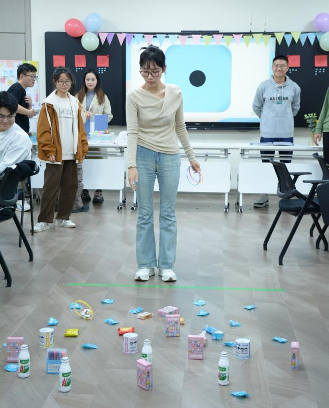 第一个游戏是圈住快乐,这是一个经典而有趣的套圈小游戏,它考验的不仅是我们的手眼协调能力,更是团队之间的配合与策略。最终同学们都套到了精美的小礼品,为自己队伍加了分。
