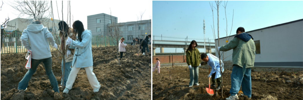 随后,大家两两组队,手拿铁锹,迈着轻快的步伐朝着果树移栽的地点走去。一到地方,同学们便迅速投入到移栽活动中。一人负责扶稳树苗,另一人则挥舞着铁锹,一下又一下地将周围的泥土填入坑中,每填一锹土,都用力地踩实,确保树苗能稳稳地扎根在这片土地上。唐老师在各小组间穿梭查看,并亲自动手示范。经过一番努力,一棵棵树苗在大家的共同努力下,如一群等待检阅的士兵般坚实挺立在果园中。