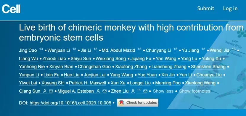 脑科学与智能技术卓越创新中心(神经科学研究所)非人灵长类研究平台孙强研究团队合作在Cell期刊发表了封面文章Live birth of chimeric monkey with high contribution from embryonic stem cells。该研究首次成功构建了高比例胚胎干细胞来源的出生存活嵌合体猴,并证明了猴胚胎干细胞可以高效的贡献到胚外胎盘组织和生殖细胞。这对于理解灵长类胚胎干细胞全能性和非人灵长类模型构建具有重要意义。
