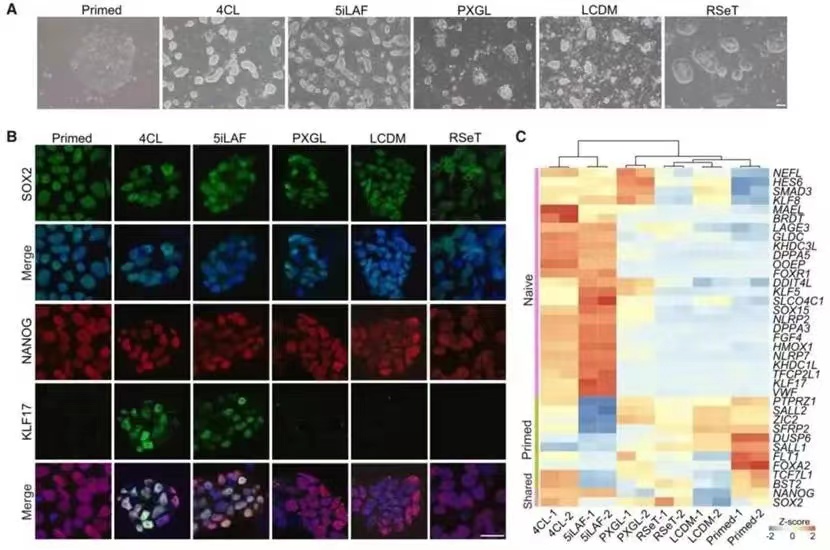 研究团队首先建立了处于6种不同培养体系下的食蟹猴胚胎干细胞,进而从克隆形态、免疫荧光、转录组、线粒体代谢、全基因组甲基化、核型分析和全基因组测序等多方面对处于不同培养条件下食蟹猴胚胎干细胞进行全面系统的评估。发现5iLAF、4CL和PXGL体系下培养的食蟹猴胚胎干细胞具有较高的多能性,而且4CL体系下的干细胞具有更好的传代稳定性和基因组稳定性(图1)。