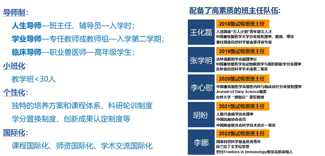 2014年试办卓越人才培养试验班,实行“一制三化”:导师制、小班化、个性化、国际化,现组建10期,累计237名学生,目前读研率为98%,出国交流率41%,科研参与率100%,发表SCI论文影响因子总数154.95,获国家级竞赛奖项59项。以2024届动物医学(卓越农林人才拔尖培养计划)试验班为例,班级27名学生,英语四六级通过率为100%,85%的同学被推免到清华、北大、中科院等双一流A类大学或科研院所,2人入选DVM项目,班级被评为“2023年五楼自拍