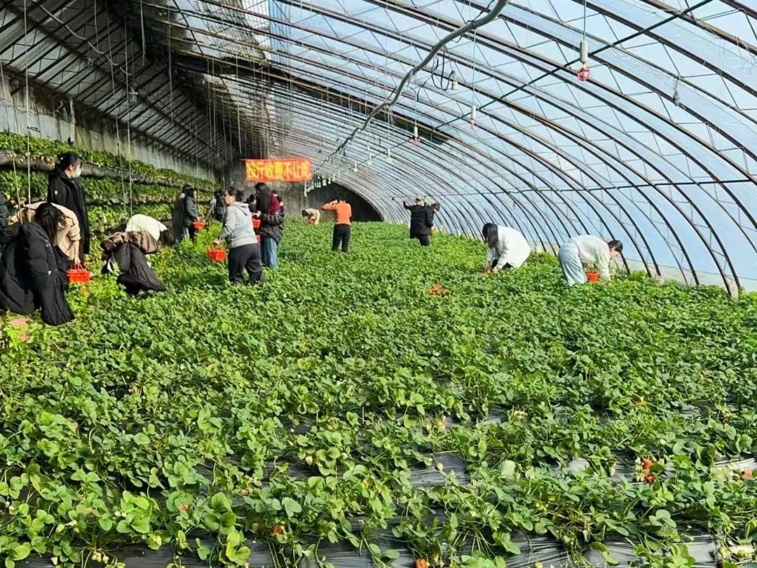 踏入草莓大棚,温暖的春日阳光洒在一排排整齐的田垄上,一阵甜美的果香迎面而来。抬眼望去,翠绿的叶片间点缀着诱人的一颗颗草莓,红彤彤的外表下藏着多汁的甜味,仿佛在向每一位前来的女教师招手。老师们手提篮子,在田垄间尽情地享受着采摘的乐趣。