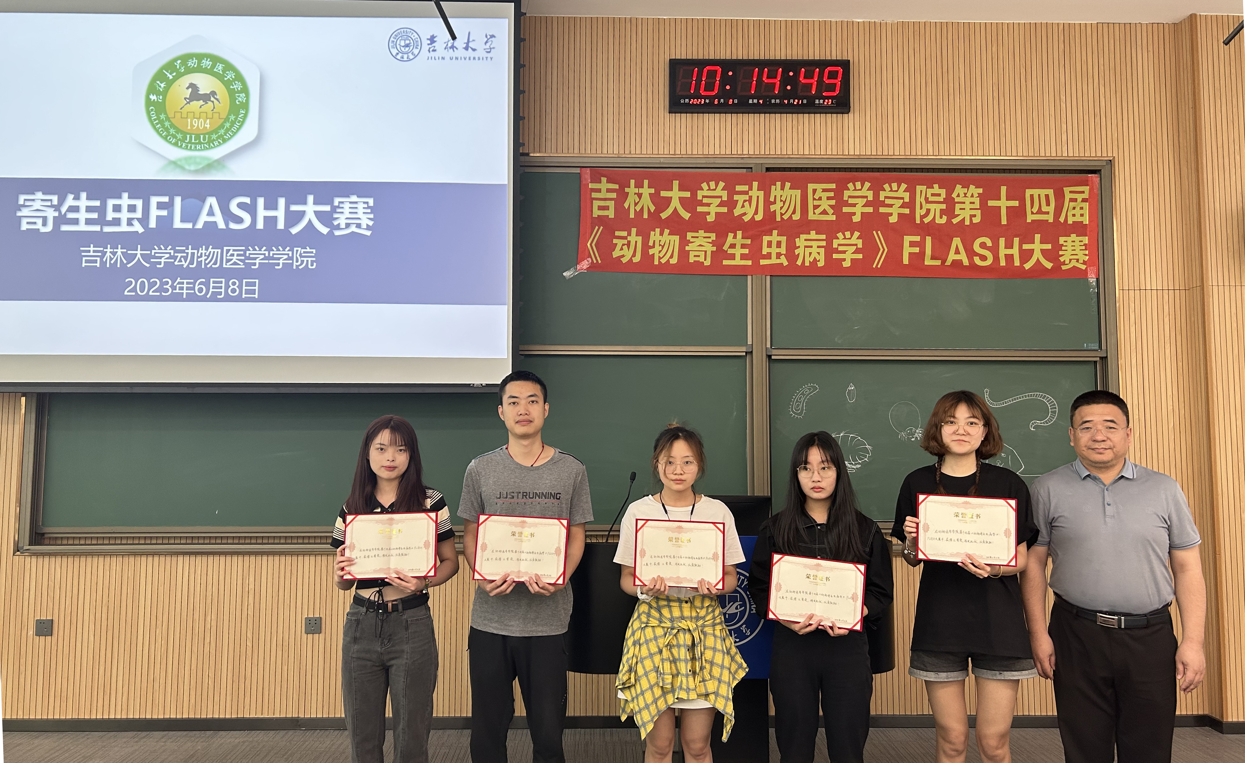 于2023年6月8日上午9点在科学讲堂100教室,成功举办了第十四届《动物寄生虫病学》FLASH大赛。大赛现场的评委嘉宾有国家级一流本科课程《动物寄生虫病学》课程负责人张西臣教授,五楼自拍
