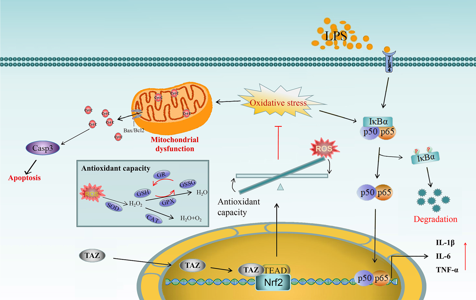 小胶质细胞的持续激活是慢性神经炎症发生的重要因素,可参与大多数神经退行性疾病的发展。TAZHippo信号通路中的关键效应蛋白,在癌细胞转移和器官发育等领域被广泛研究,但其在小胶质细胞介导的炎症反应中的功能尚未见报导。课题组研究发现,过表达TAZ可阻止小胶质细胞中促炎细胞因子的释放。TAZ进入细胞核后可与TEAD相互作用,锚定于Nrf2启动子区域从而激活Nrf2的转录,促进Nrf2的核转位,增强细胞的抗氧化能力,降低细胞内ROS水平,减轻细胞的氧化应激,阻止NF-κB信号通路的激活。同时,TAZ可通过Nrf2来改善细胞内ATP水平、mtDNA拷贝数和线粒体膜电位,阻止线粒体通透性转换孔的打开,抑制细胞色素C从线粒体释放到胞质中,减少小胶质细胞的凋亡。研究结果可为神经退行性疾病的治疗提供一个潜在的新靶点。
