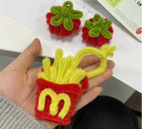活动现场,编织材料和工具一应俱全,扭扭棒、编织线等材料整齐摆放,供同学们自由选择。参与者根据个人兴趣分成多个小组,有的编织出可爱的小恐龙,憨态可掬;有的制作出温馨的圣诞树,节日氛围浓厚;还有的则编织出优雅的郁金香和精致的烟花棒;更有同学积极发挥想象力,动手创作属于自己的独特作品。每一件作品都凝聚着同学们的智慧和心血,也展现了他们对美好生活的向往和追求。