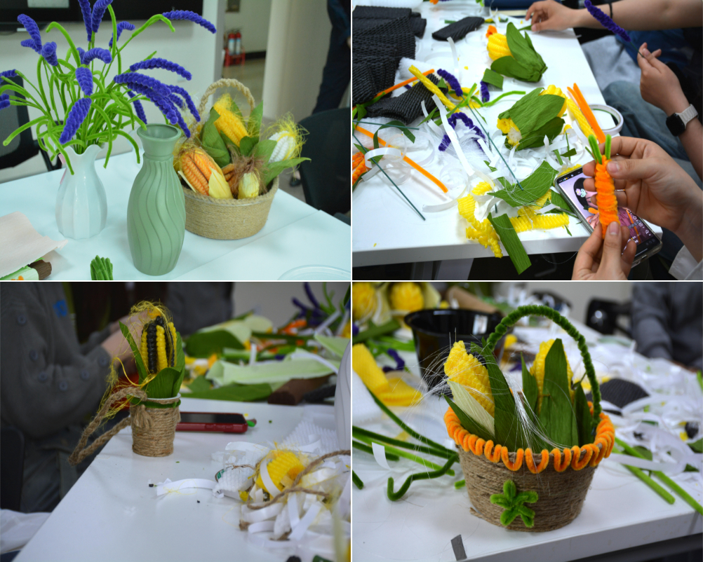 本次活动通过创意手工制作,引导同学们利用生活中平常的材料,如外卖盒、水果网套、皱纹纸等,变废为宝,制作出薰衣草花束、玉米等精美作品。活动开始,主持人介绍了本次的特邀嘉宾公寓管理员王德全老师和八公寓宿管阿姨孙秀敏。孙秀敏阿姨手把手传授编织要领,在零距离的互动交流中,让环保理念在温馨的氛围中传递,更展现出校园生活中“人人都是美育践行者”的和谐图景。