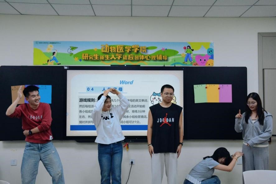 最后是“人体字母”游戏。各小组抽取英文单词后,需在短时间内用身体拼出字母造型,并合作完成展示。台上创意频出,台下积极猜词,互动中不仅锻炼了团队默契,更展现出成员的想象力与协作精神。