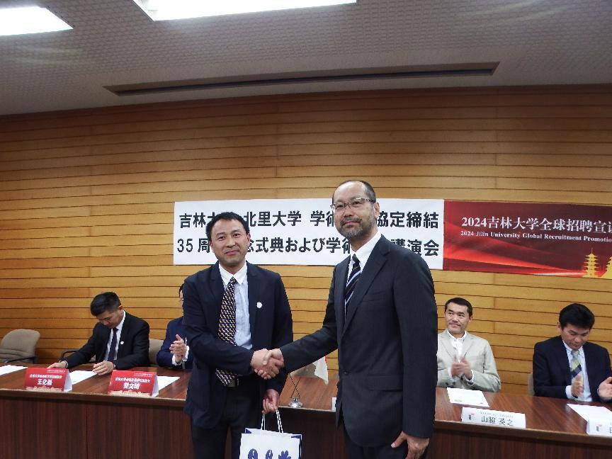 党委书记饶家辉、副院长贺文琦、王化磊、外事秘书张敏婕,北里大学兽医学部学部长冈野昇三、学科长山胁英之、事务长漆畑勇氏、国际交流委员会委员长胡东良及师生40余人参加了此次庆祝仪式,仪式由北里大学田边太志教授主持。