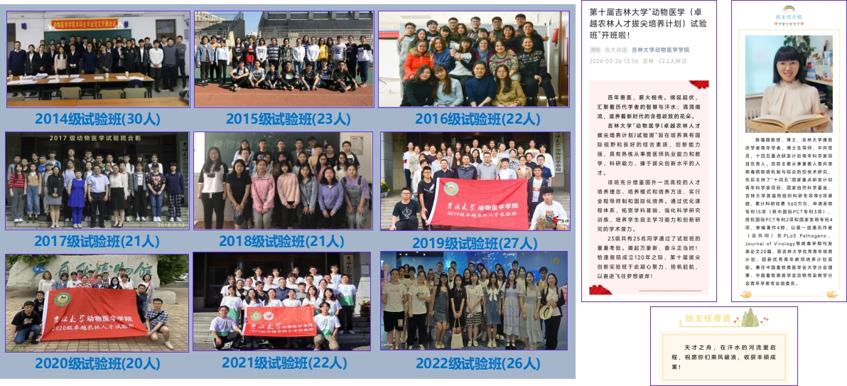 2014年试办卓越人才培养试验班,实行“一制三化”:导师制、小班化、个性化、国际化,现组建10期,累计237名学生,目前读研率为98%,出国交流率41%,科研参与率100%,发表SCI论文影响因子总数154.95,获国家级竞赛奖项59项。以2024届动物医学(卓越农林人才拔尖培养计划)试验班为例,班级27名学生,英语四六级通过率为100%,85%的同学被推免到清华、北大、中科院等双一流A类大学或科研院所,2人入选DVM项目,班级被评为“2023年五楼自拍
